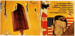 Fig.: Mimmo Rotella: Omaggio al Presidente. 1963 In the field of popular music very much the same process of affirmative negation can be visible (or audible) in works like Jimi Hendrix's "Star spangled banner." |