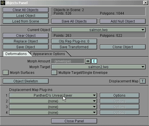 This is the tricky part now. In Lightwaves objects panel you will find PantherD's Unreal Saver in the Displacement plugins, if you have properly installed it. PantherD's saver operates