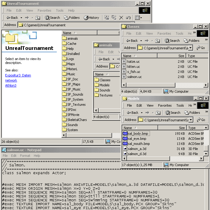 PantherD's plugin created an Unreal Script file called salmon.uc and the static mesh information in salmon_d.3d and the animation data in salmon_a.3d. The Script file has been manually edited to get the right name for the default movement - "Swimming" in our case - and to adjust texture file names if one does not use the ones the plugin suggests automatically. (Remember that Unreal textures need to be .pcx or .bmp files with powers of 2 dimensions. .tga files or .tiffs won't work even if they are nicely displayed in Lightwave.)