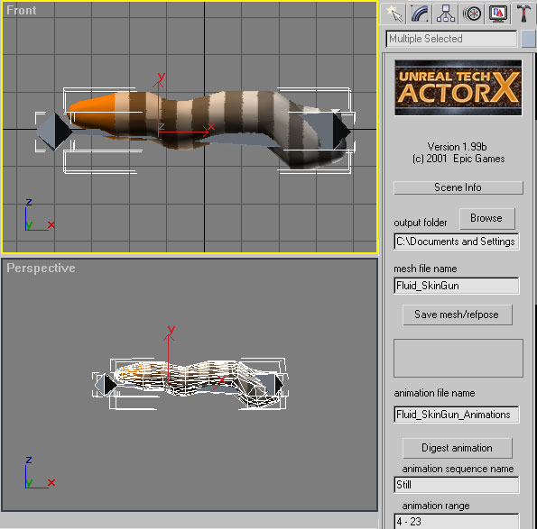 Go to the Edit menu and select "Linkup anim and mesh". You should see a list of animations for your Fluid_SkinGun now.