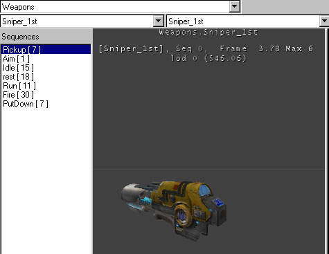 Open the animations browser. Open the Weapons package and select the SniperRifle weapon. You should start with Sniper_1st which is the rifle as seen in 1st person view.