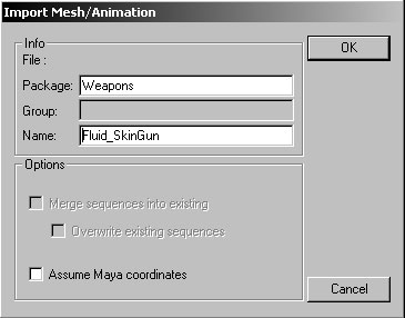 Just import the new mesh ("Fluid_SkinGun") into your Weapons package