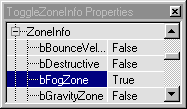 The crucial parameter is "bFogZone". You have to set this parameter to "True" as is shown in the image to the left. Only if "bFogZone" is set to true, the changes of the parameters descibed underneath will result in visible effects. Fog is a property which is always connected to a light which works as a fog emitter. If there is no light there is no fog. These are the parameters defining how your fog will look like. Note that these are properties of the light you want to be surrounded by fog, not the zone. Their meaning in regard to fog are: