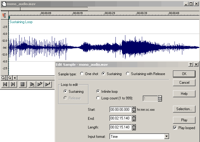Next got to the "Special" menu and select "Edit Sample". In the dialogue box shown above you might want to check "Sustaining" and "Infinite Loop".