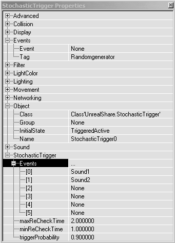 Change the "TriggerProbability" from 0.0 to a value in between 0.000001 and 1.000000. "MaxReCheckTime" and "MinReCheckTime" define the minimum delay for the randomgenerator to generate a new event and the maximum delay to do so. If you set "MinReCheckTime" to 10, this means that there can be no sound following the sound presently played earlier than 10 seconds after the start time of the present sound. It does not mean that 10 seconds after the first sound the second has to be played, because the second one could be started anytime in between 10 seconds from the start of the first one and "MaxReCheckTime" from the start of the first one. Also if the randomgenerator does not produce an event there will be another "MinReCheckTime" at least to wait for the next sound.